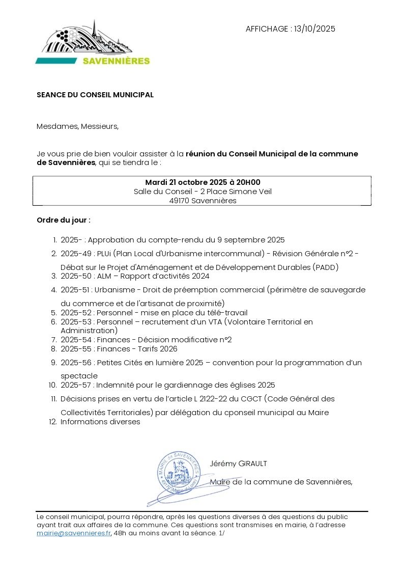 ORDRE DU JOUR CONSEIL MUNICIPAL MARDI 21 OCTOBRE 2025 À 20H