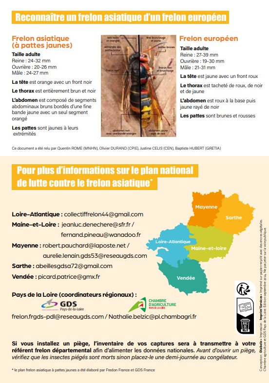La lutte contre le frelon à pattes jaunes (Vespa velutina), souvent appelé frelon asiatique, contribue à la protection de la biodiversité et à la sécurité des habitants. L’une des actions les plus efficaces est le piégeage de printemps, qui cible les reines fondatrices afin de limiter la formation de nouveaux nids. Ce piégeage peut être réalisé par des particuliers, ou de manière coordonnée par la collectivité ou la filière apicole, pour plus d’efficacité et de sécurité.