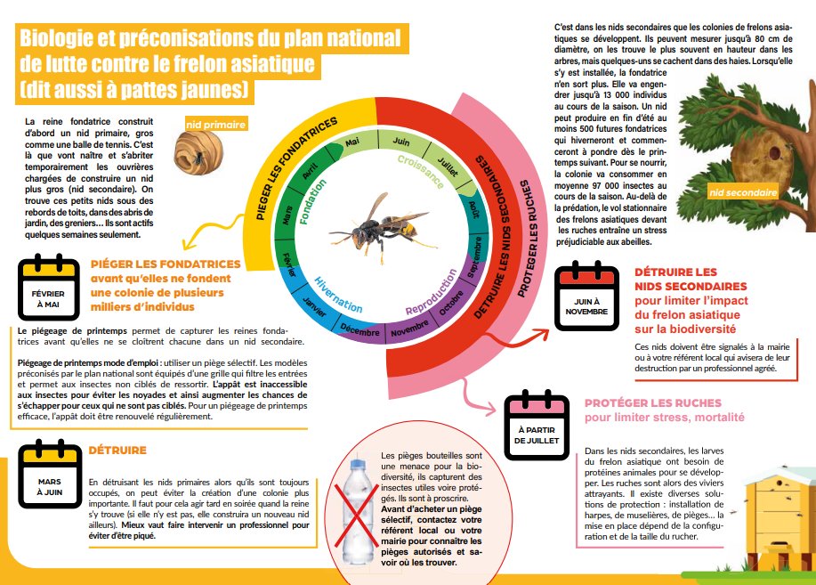 Les pièges recommandés sont équipés d’une grille calibrée qui empêche la capture des insectes non ciblés tout en leur permettant de ressortir, et d’un système qui évite leur noyade (cf. photos pièges/légende). La destruction des nids complète cette action : le repérage et le signalement des nids primaires et secondaires (cf. photos nids/légende) à la mairie facilitent leur élimination. Ces efforts collectifs permettent de protéger les pollinisateurs et d’assurer la sécurité de tous. Pour plus d’informations, rapprochez-vous de votre mairie.