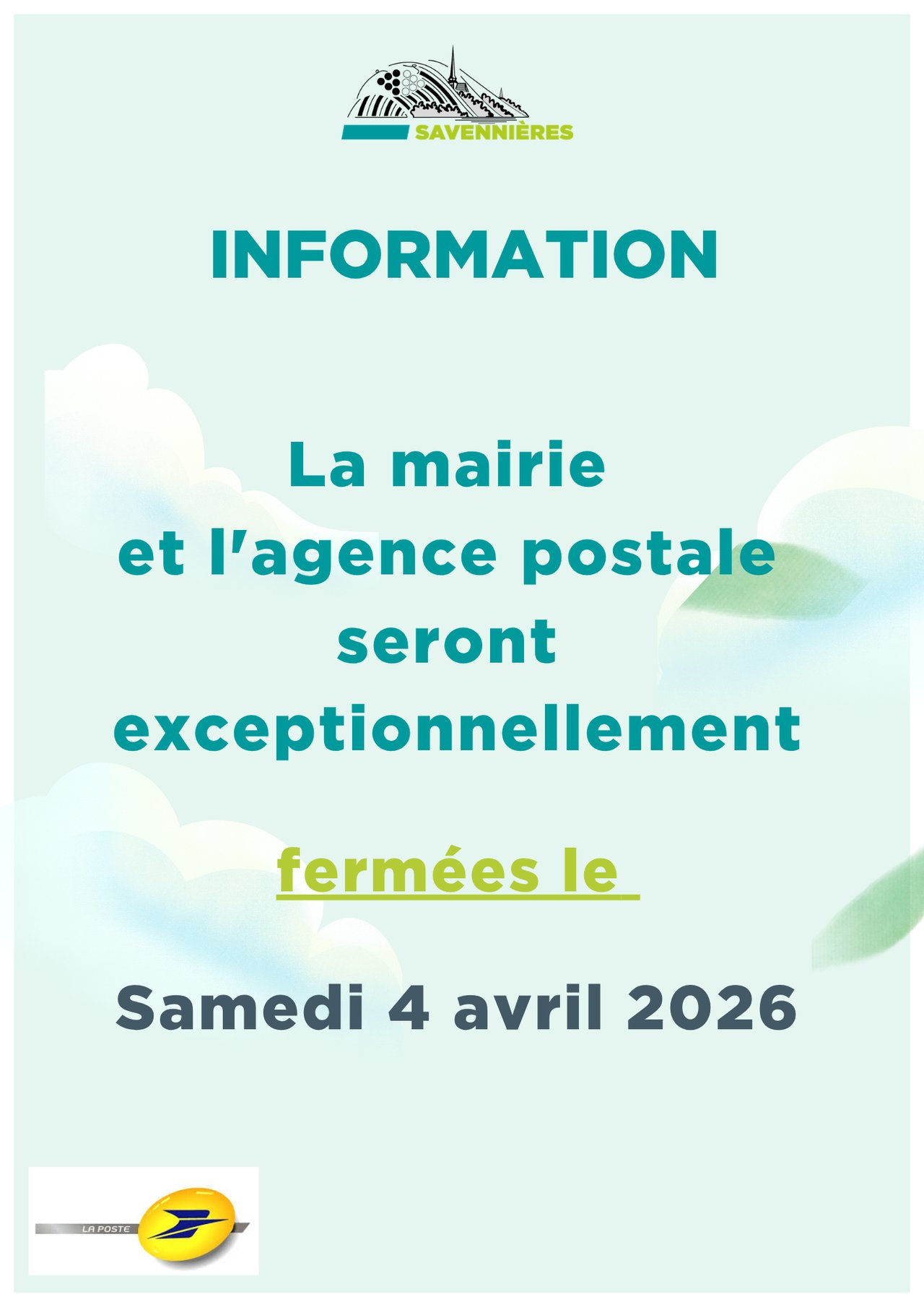 FERMETURE DE LA MAIRIE ET DE L'AGENCE POSTALE