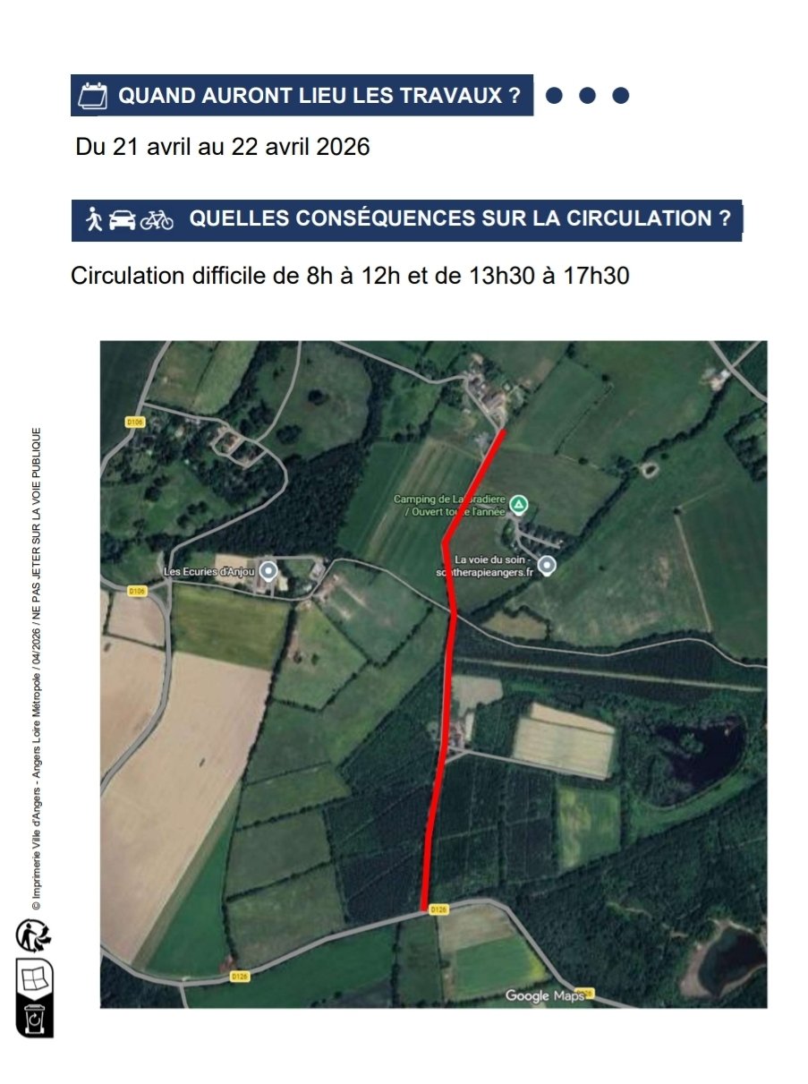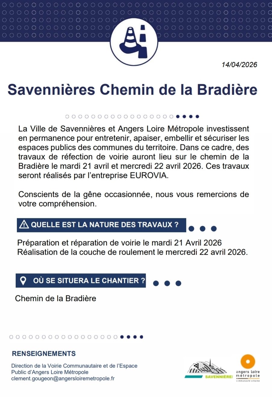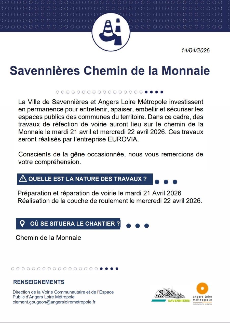 Durant l'intervention des 21 et 22 avril, la circulation pourra être perturbée sur les secteurs de la Bradière et de la Monnaie. Nous vous remercions de votre compréhension.