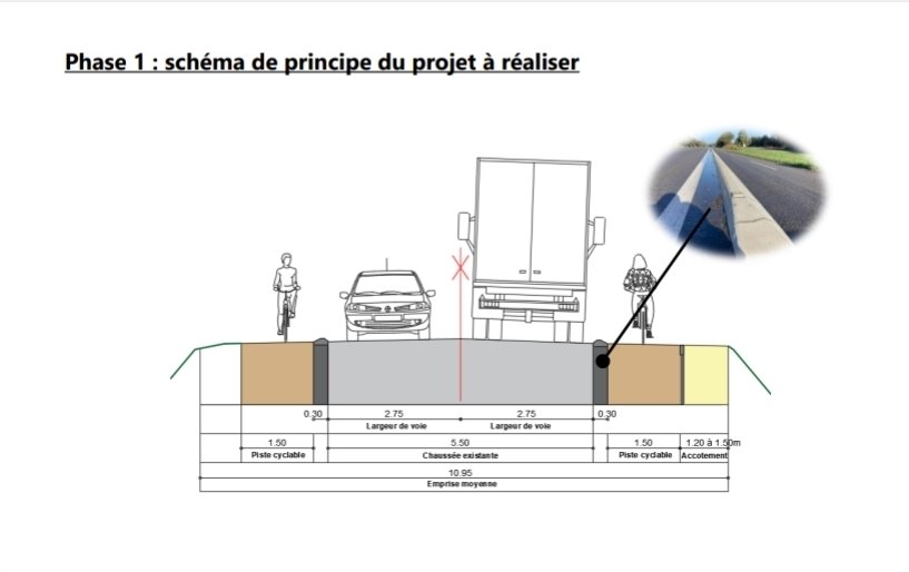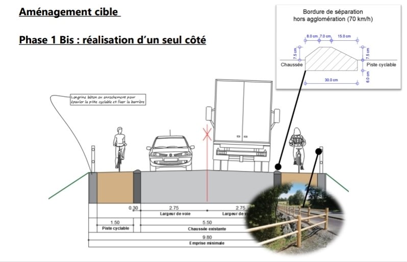 • Aménagement : Création de pistes cyclables latérales avec bordures de séparation et traitement des accotements pour la continuité du sentier de randonnée GR35.