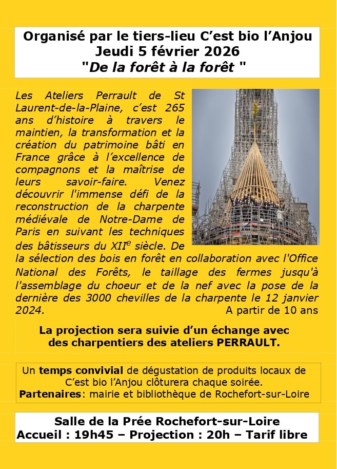 "Le tiers-lieu C'est bio l'Anjou de Rochefort-sur-Loire organise son ciné-débat mensuel le jeudi 5 février à 19h45 salle de la Prée avec le film "De la forêt à la forêt " en partenariat avec les ateliers Perrault de St Laurent-de-la-Plaine. Venez découvrir l'immense défi de la reconstruction de la charpente médiévale de Notre-Dame de Paris en suivant les techniques des bâtisseurs du XIIe siècle.