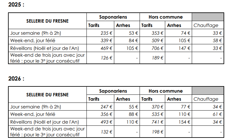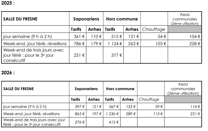 Les locaux mis à disposition comprennent : la grande salle, la scène et la loge, la cuisine, les vestiaires et sanitaires, la terrasse.